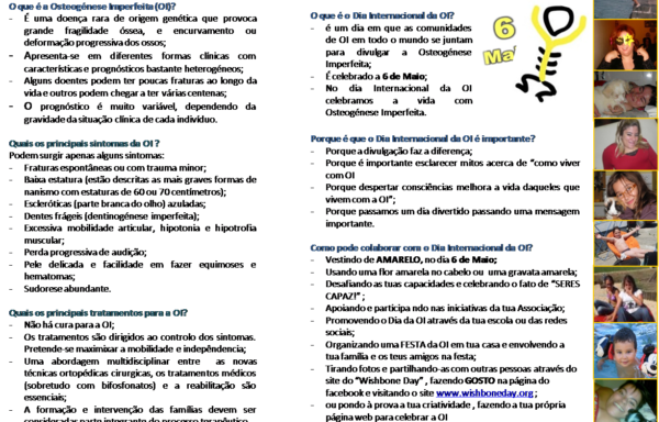 O Projeto “INFORMAR PARA MELHORAR” permitirá levar informação atualizada aos portadores de Osteogénese Imperfeita, aos profissionais de saúde e de educação e também à sociedade civil, promovendo as competências pedagógicas da Associação enquanto instituição com credibilidade técnico-científica no âmbito desta patologia. Com esta medida a APOI pretende, minimizar a falta de informação sentida a nível geral e … Continue a ler Projeto “Informar para melhorar” – 2010